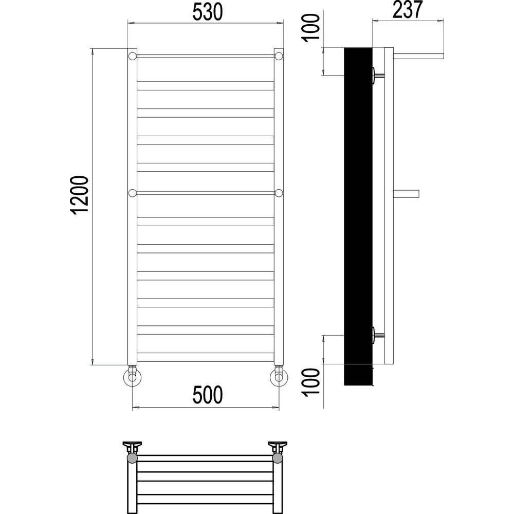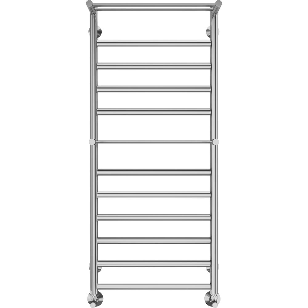 Полотенцесушитель обладает размерами 53,2 см в ширину и 120 см в высоту с межосевым расстоянием 50 см, что делает его компактным и практичным для любой ванной комнаты. Подключение осуществляется горизонтально, а в конструкции используются трубы с контактной сваркой для максимальной прочности. Устройство подвесное, включает отражатели, кран Маевского для удаления воздуха из системы, а также крепления для легкой и безопасной установки.