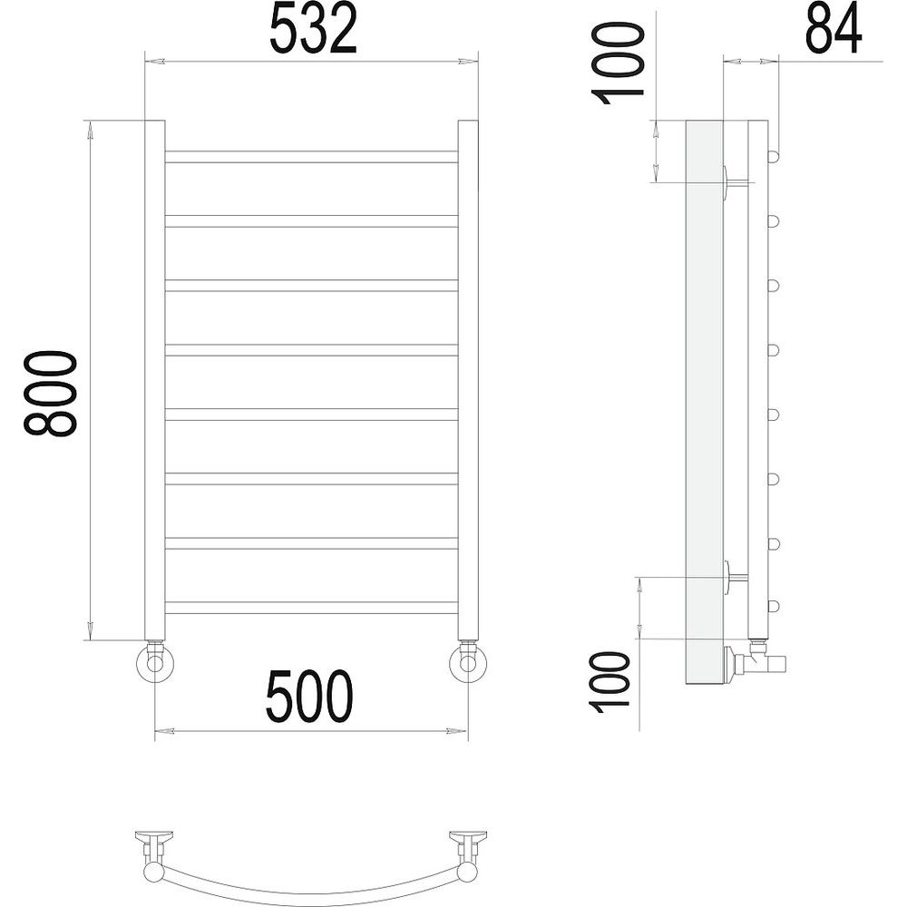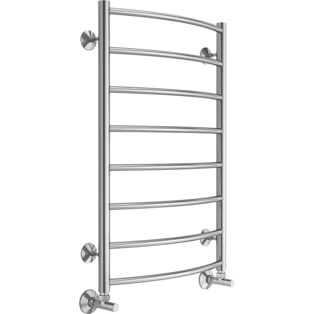 Полотенцесушитель имеет габариты 53,2x80 см и межосевое расстояние 50 см, что делает его компактным и удобным для установки в любые ванные комнаты. Диаметр вертикальных стоек составляет 32 мм, а горизонтальных перекладин — 18 мм. В комплекте предусмотрен кран Маевского для удаления воздуха из системы и комплект креплений. Нужна установка? Не забудьте приобрести дополнительные вентили и отражатели, так как они в комплект не входят. Продукция производится в России и имеет 10-летнюю гарантию.