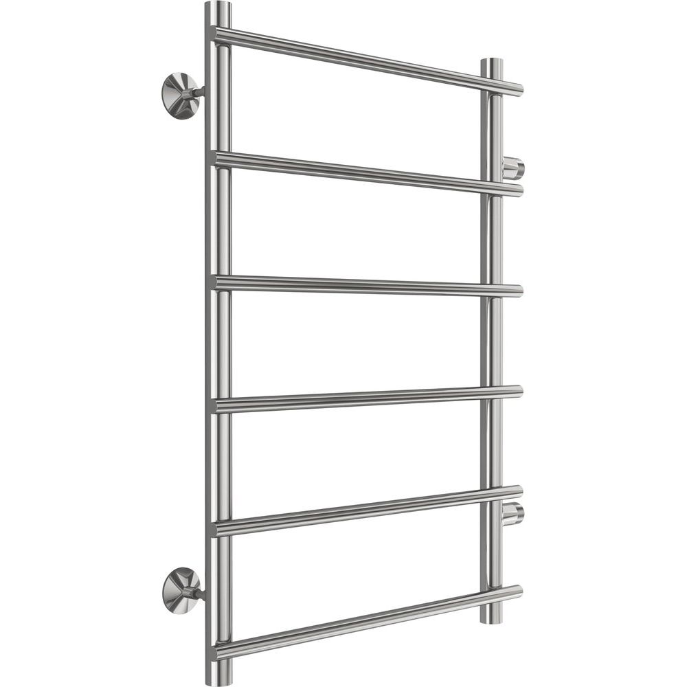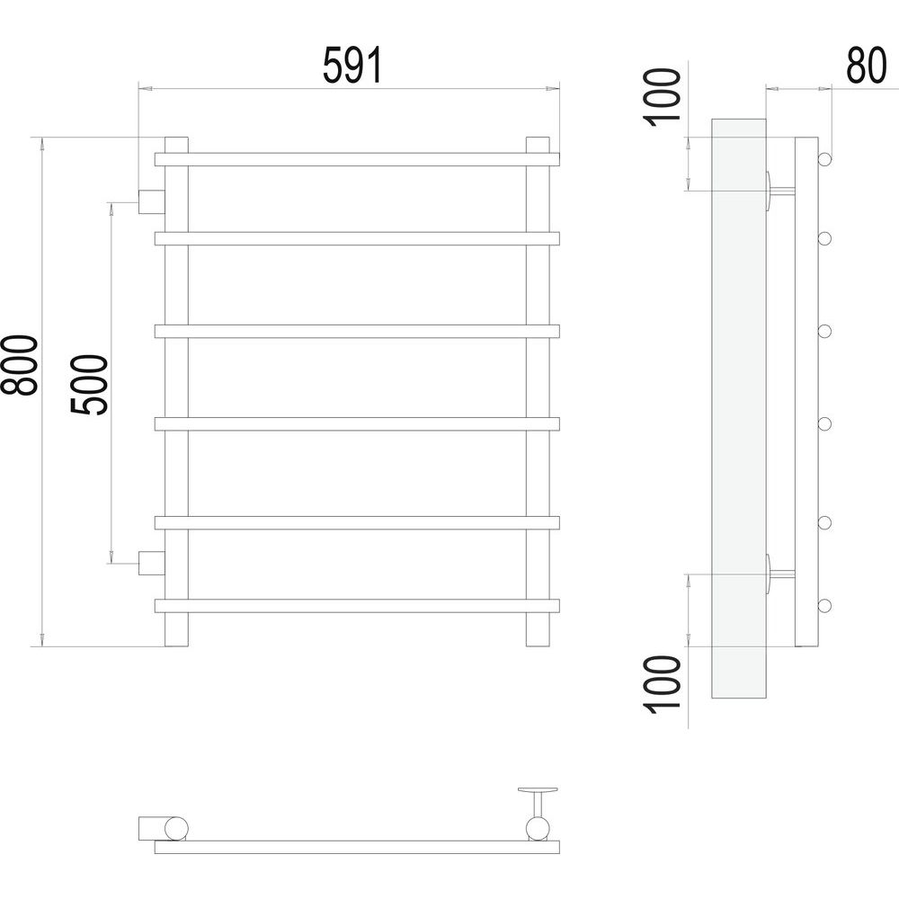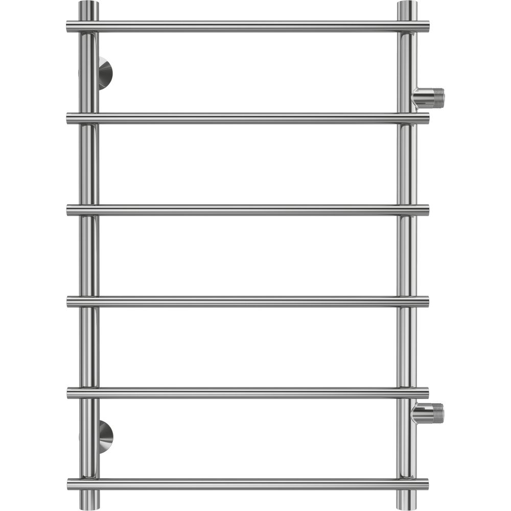 Габариты полотенцесушителя составляют 59,1 на 80 см, что делает его великолепным решением для ограниченных условий пространства. Межосевое расстояние - 50 см, а конструкция предусматривает вертикальное подключение с подачей воды сверху и выпуском потока снизу. В комплекте вы найдете кран Маевского для удаления воздуха и необходимый набор креплений.