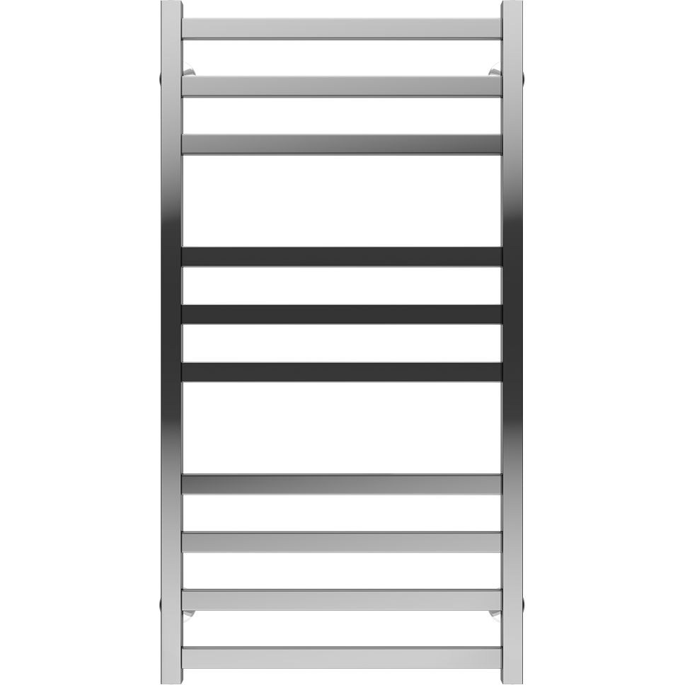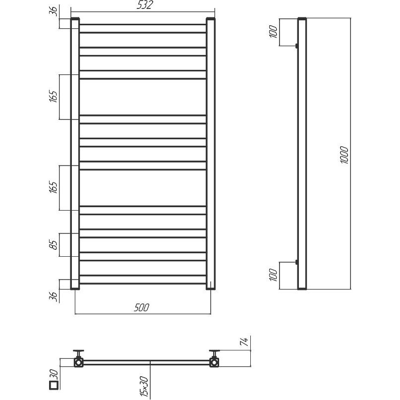 Полотенцесушитель имеет размеры 53,2 см в ширину и 100 см в высоту, с межосевым расстоянием подключения 50 см. Предназначен для горизонтального подключения и подвесного размещения. Изделие оснащено отражателями и краном Маевского, который облегчает удаление воздуха из системы, что помогает в поддержании оптимальной работоспособности.