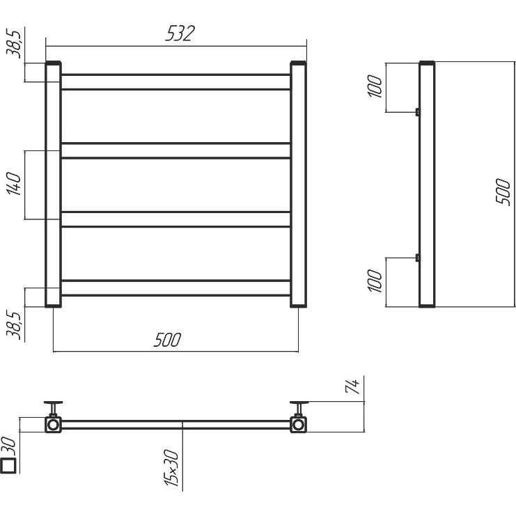 Полотенцесушитель имеет размеры 53,2x50 см и предназначен для горизонтального подключения с межосевым расстоянием 50 см. Изделие выполнено из трубы с электросварным швом и покрыто нержавеющей сталью, что обеспечивает его коррозионную стойкость и долговечность. Мощность прибора составляет 149 Вт, что позволяет согревать площадь до 1.5 м2. В комплект входят кран Маевского для удаления воздуха, отражатели и крепления для надежной установки.