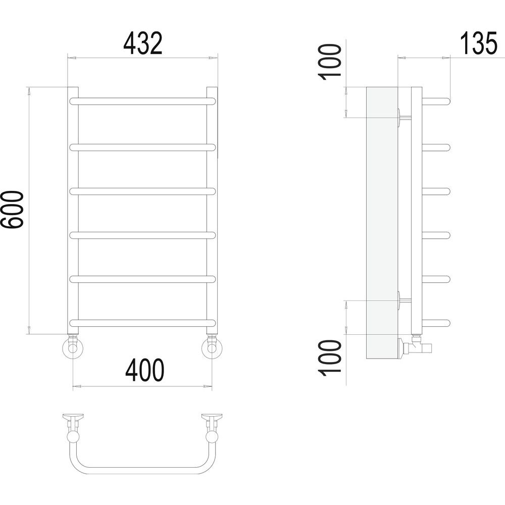 Полотенцесушитель "Terminus Стандарт П6" имеет габариты 43,2x60 см и межосевое расстояние 40 см, что делает его компактным и подходящим для большинства ванных комнат. Обогреваемая площадь составляет 2 м², а номинальная теплоотдача — 198 Вт, что обеспечивает эффективный обогрев пространства. Изделие оснащено краном Маевского для удаления воздуха из системы, а стандартные крепления гарантируют надежность подвески. Изготовлен в России, полотенцесушитель рассчитан на горизонтальное подключение.