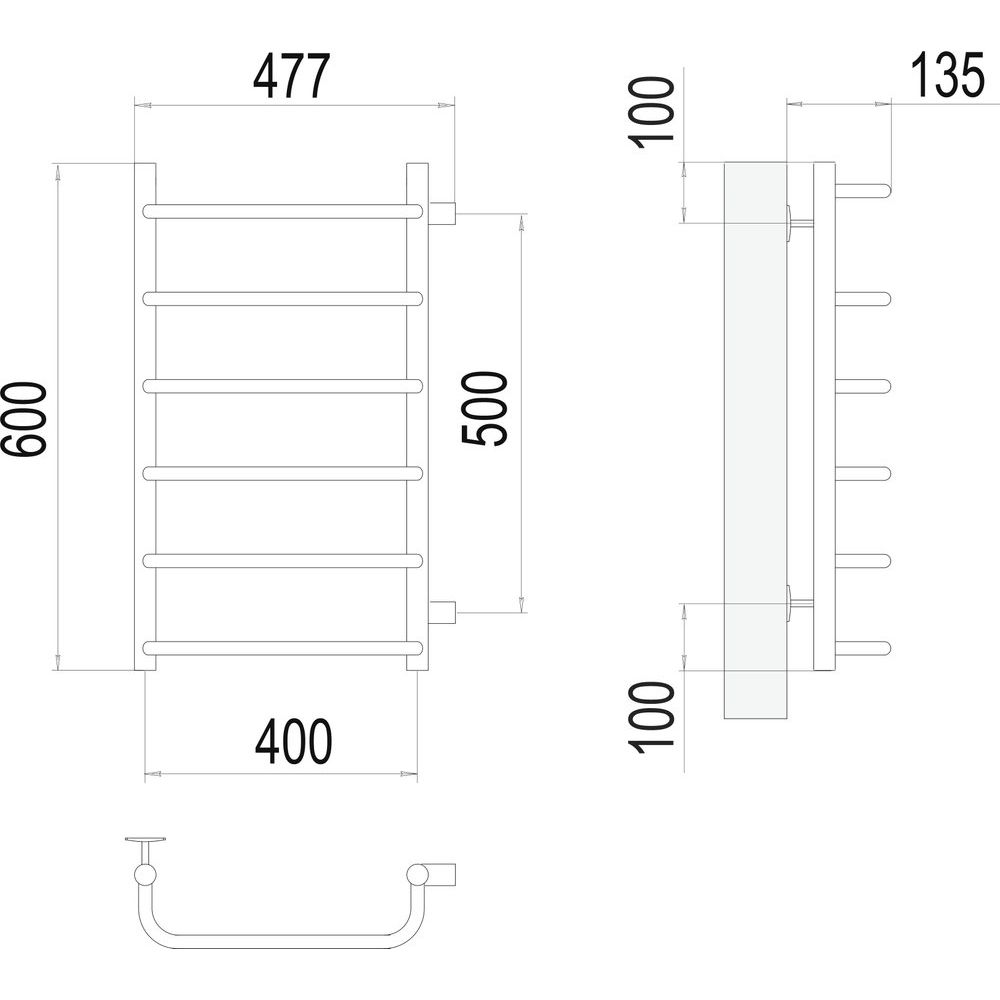 Полотенцесушитель обладает размерами 47,7 см в ширину при высоте 60 см, межосевое расстояние составляет 50 см. Он легко обогревает до 2 м2 площади, обеспечивая теплоотдачу в 198 Вт. Простая установка с вертикальным подключением, с подачей воды сверху и выпуском потока снизу, делает этот прибор удобным выбором для любой семьи. Комплектуется краном Маевского для удаления воздуха из системы, а также креплениями.