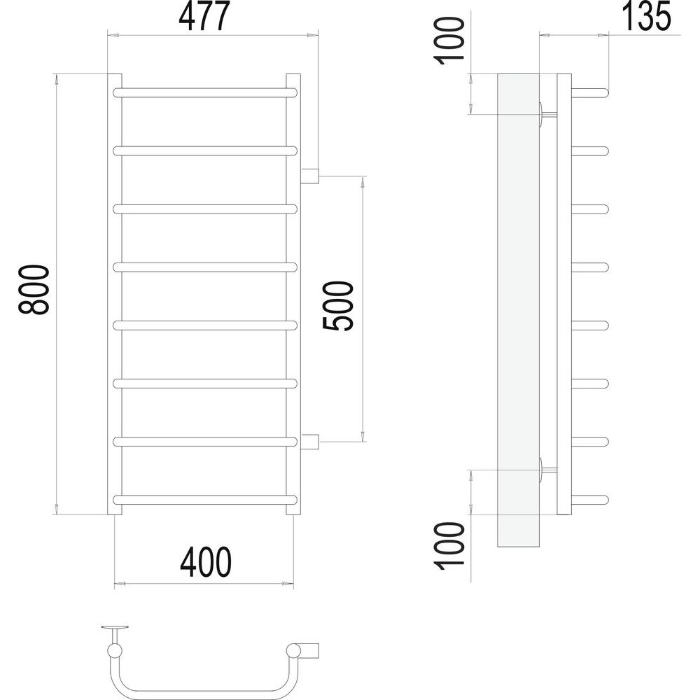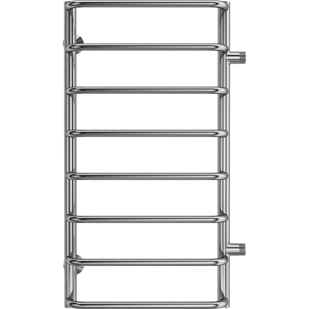 Диаметр вертикальных стоек составляет 32 мм, а перекладин — 18 мм, что обеспечивает прочность конструкции. Размер полотенцесушителя — 47,7x80 см, при этом межосевое расстояние составляет 50 см, благодаря чему он идеально впишется в большинство ванной комнат. Терминус Стандарт П8 имеет боковое подключение с подачей воды сверху и выпуском снизу, что обеспечивает равномерный обогрев площади в 2,5 м2. Для удобства использования полотенцесушитель оборудован краном Маевского для удаления воздуха из системы.