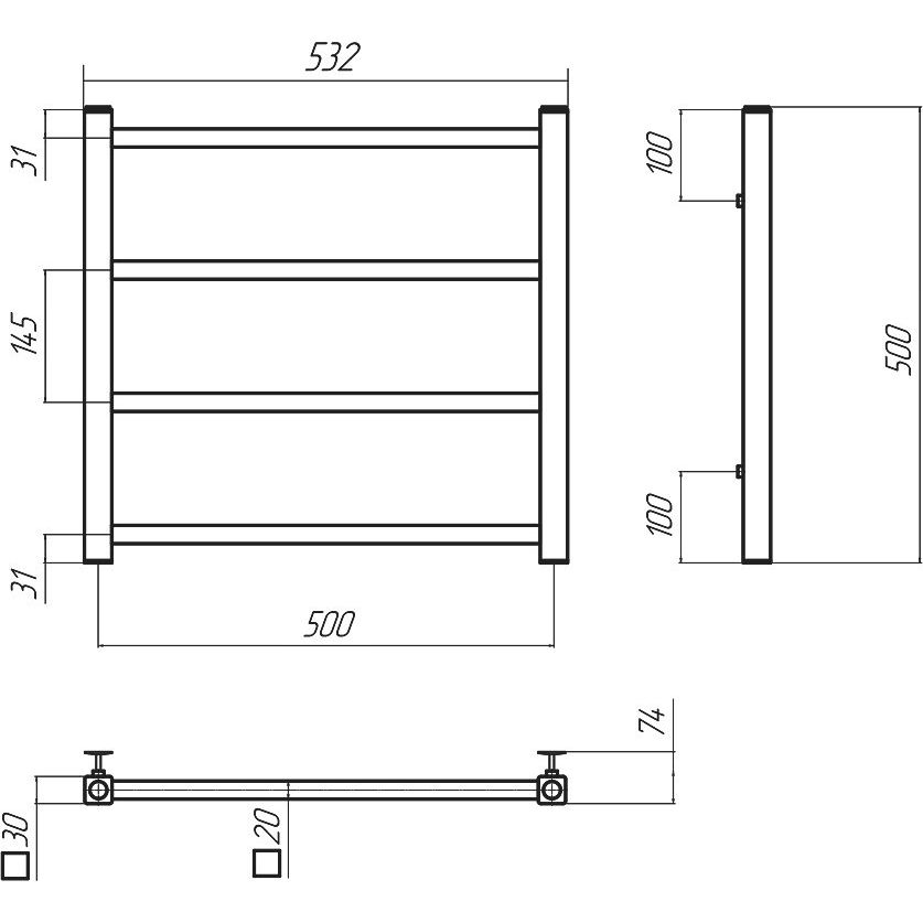 Полотенцесушитель имеет размеры 53,2x50 см и предназначен для обогрева площади до 1,5 м2. Модель оснащена трубами с электросварным швом, что обеспечивает её прочность и надежность. Продукт подвесной, что делает его компактным и удобным для размещения в ограниченных пространствах. В комплект входят отражатели и кран Маевского, облегчающие удаление воздуха из системы. Межосевое расстояние составляет 50 см, позволяя оптимально использовать отопительное оборудование, а монтаж происходит посредством горизонтального подключения.
