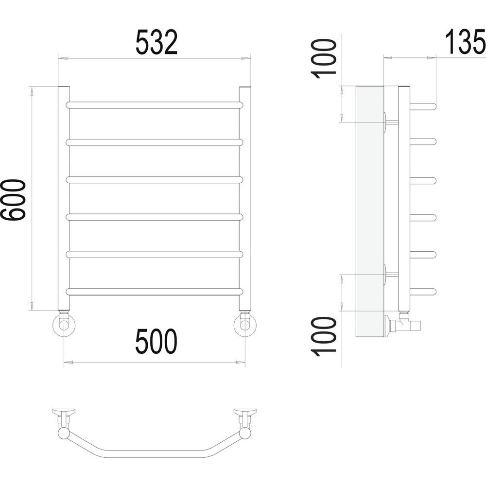 Полотенцесушитель имеет размеры 53,2x60 см и межосевое расстояние 50 см, что подходит для большинства стандартных ванных комнат. Его теплоотдача составляет 207 Вт, что обеспечивает обогрев площади до 2 м2. Диаметр вертикальных стоек — 32 мм, горизонтальных перекладин — 18 мм. Оборудование оснащено краном Маевского для удаления воздуха из системы и креплениями. Подключение осуществляется горизонтально.