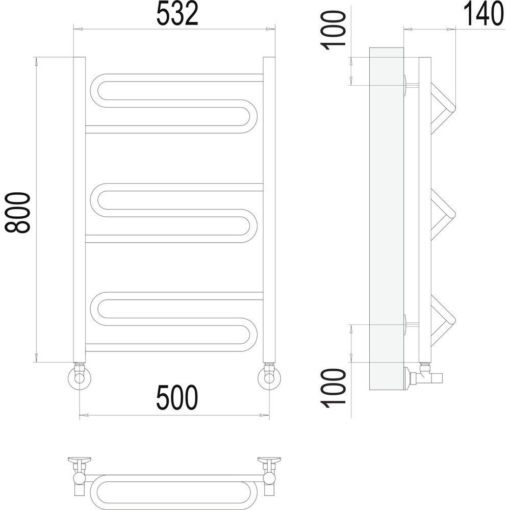 Полотенцесушитель обладает габаритами 53,2x80 см и межосевым расстоянием 50 см, что делает его подходящим для размеренной установки в различных интерьерах. Направление подключения горизонтальное, оно упрощает монтаж, а кран Маевского в комплекте позволяет легко удалить воздух из системы. Производительная теплоотдача 288 Вт эффективно обогревает до 3 м² пространства.