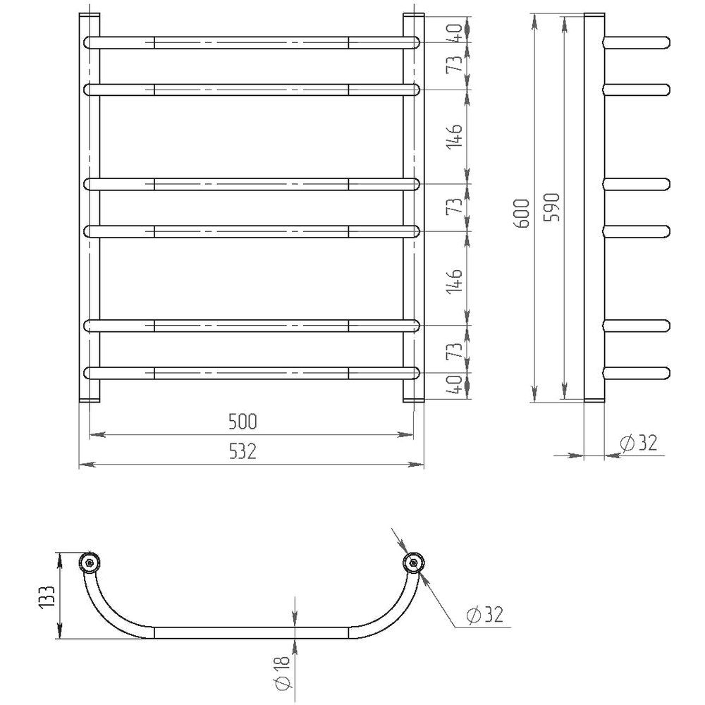 Полотенцесушитель имеет размеры 53,2х60 см с межосевым расстоянием подключения 50 см, что обеспечивает его универсальную установку. Горизонтальное подключение делает его монтаж максимально простым и удобным. Используемая труба с электросварным швом гарантирует высокую прочность и надежность конструкции, а специальные крепления облегчают процесс установки.