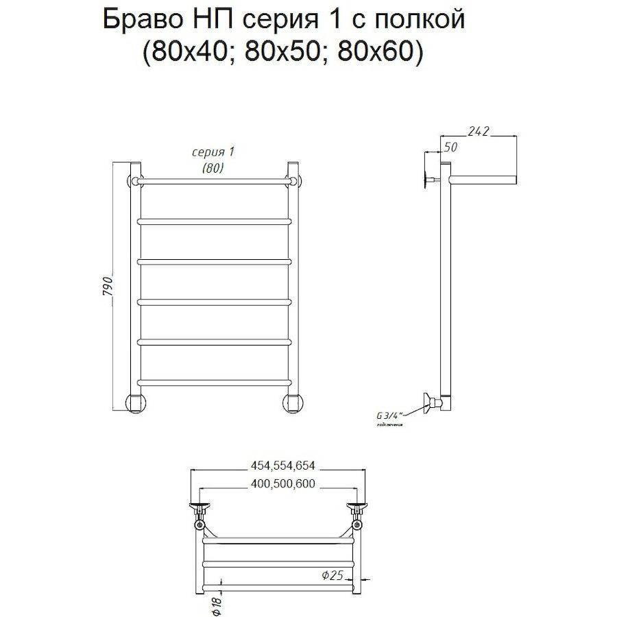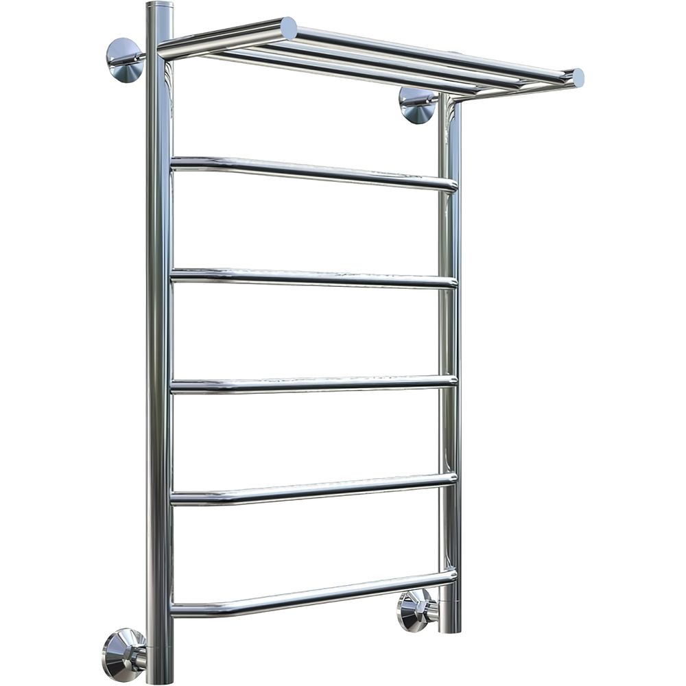 Полотенцесушитель имеет размеры 55,4x80,6 см и оборудован полкой для удобства. Он поддерживает несколько вариантов подключения: горизонтальное (с межосевым расстоянием 50 см), вертикальное (с межосевым расстоянием 75,6 см) и диагональное. Подача воды осуществляется сверху, а выпуск потока — снизу. Устройство способно обогреть площадь до 3.73 м², что делает его идеальным решением для стандартной ванной комнаты.