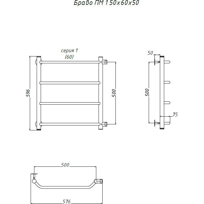 Полотенцесушитель «Тругор ЛЦ Браво ПМ 1», относящийся к категории водяных, имеет размеры 57,6x59,6 см с межосевым расстоянием 50 см. Подвесная модель имеет площадь обогрева 2 м², что делает её подходящей для небольших санузлов. Все работы по созданию изделия выполнены из нержавеющей стали с использованием паяных труб для большей надежности. В комплект входят все необходимые крепления для установки. Произведено в России. Гарантия на изделие составляет 10 лет.
