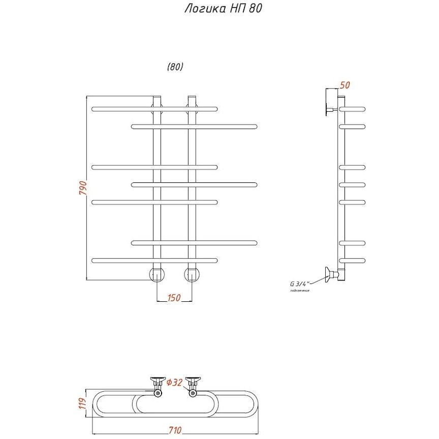 Полотенцесушитель имеет размеры 71x80,6 см и подходит для обогрева площади до 4.66 м². Его межосевое расстояние составляет 75.6 см для вертикального подключения и 15 см для горизонтального. Устройство поддерживает несколько способов подключения: горизонтальное, вертикальное (подача воды сверху, выпуск снизу) и диагональное. Комплектация включает паянную трубу, отражатели и кран Маевского, который поможет удалить воздух из системы. Изделие монтируется подвесным способом и поставляется с креплениями. Производитель — Россия.
