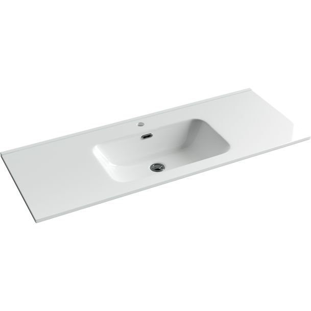 Размеры раковины составляют 121x46,5 см, обеспечивая простор для удобного использования. Она устанавливается сверху, и изготовлена из высококачественного фаянса. Раковина рассчитана на сифон диаметром 3.2 см. В комплект входит слив-перелив и одно готовое отверстие под смеситель, а также два намеченных отверстия, которые можно задействовать по необходимости. Обратите внимание, что донный клапан необходимо приобрести отдельно.