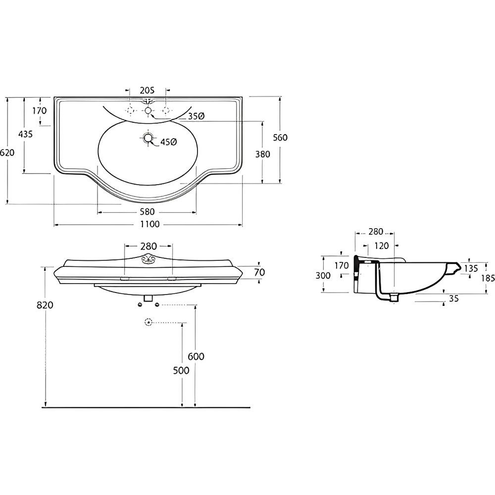 Раковина Azzurra Jubilaeum 110 имеет размеры 110x62 см, что делает её идеальной для просторной ванной комнаты. Изготовлена из прочного фаянса, обеспечивающего долговечность и устойчивость к воздействию воды. В комплекте идет встроенный слив-перелив, что экономит время и силы на установку. Раковина оснащена одним готовым отверстием для смесителя и двумя дополнительными намеченными отверстиями, что предоставляет гибкость в выборе аксессуаров. Подходит для сифона диаметром 3.2 см, однако донный клапан следует приобретать отдельно. Гарантия на изделие — 1 год.