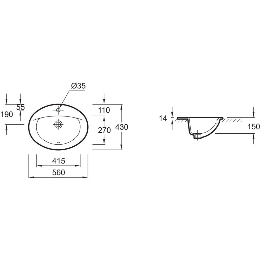 Раковина шириной 56 см и глубиной 43 см выполнена из высококачественного фарфора и предназначена для установки сверху. В комплект входит слив-перелив, а также имеется одно готовое отверстие и два намеченных для установки смесителя. Подключение к сифону производится через отверстие диаметром 3.2 см; донный клапан потребуется приобрести отдельно.