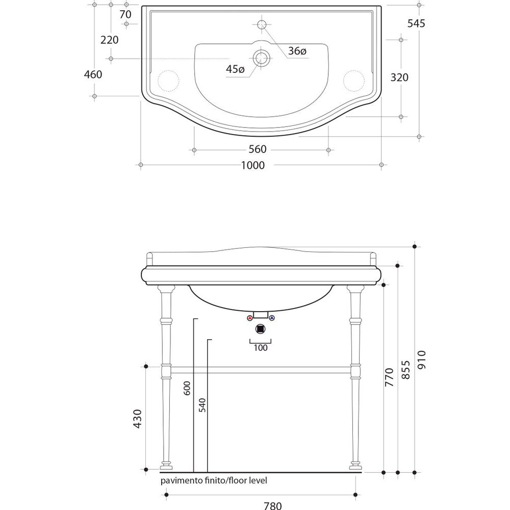 Раковина Kerasan Retro 1050 1W имеет ширину 100 см и глубину 54,5 см, что обеспечивает комфортное использование. Выполнена из прочного фарфора, отличающегося устойчивостью к царапинам и пятнам, и оснащена встроенным сливом-переливом.