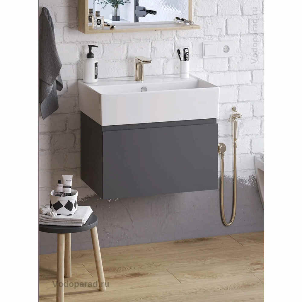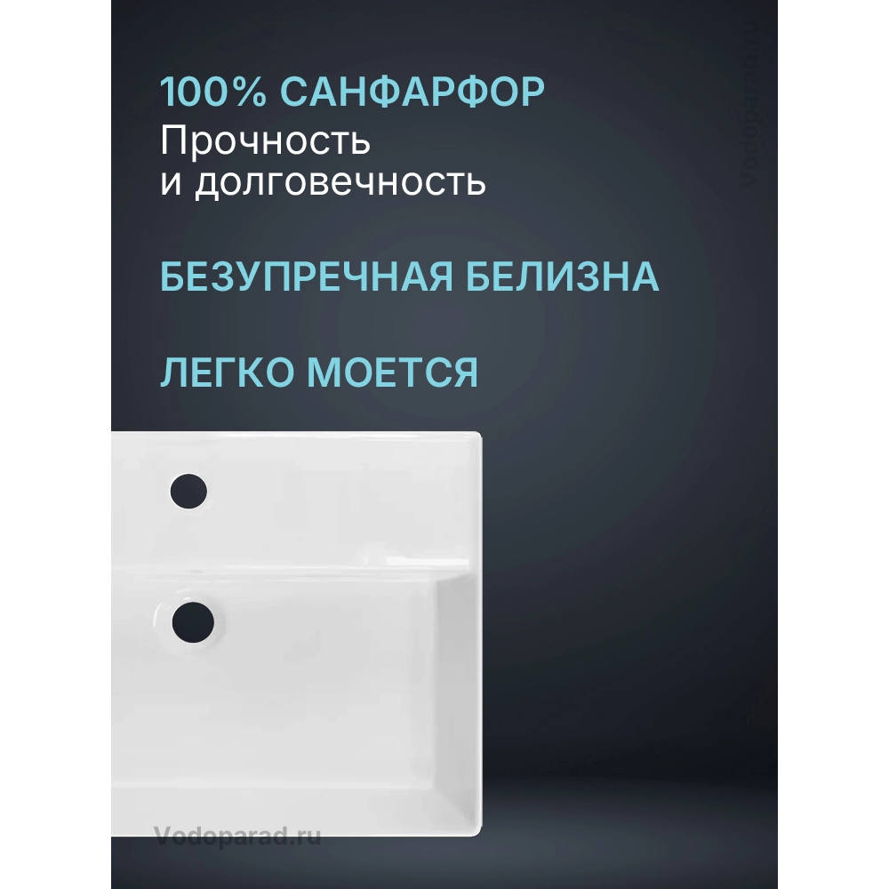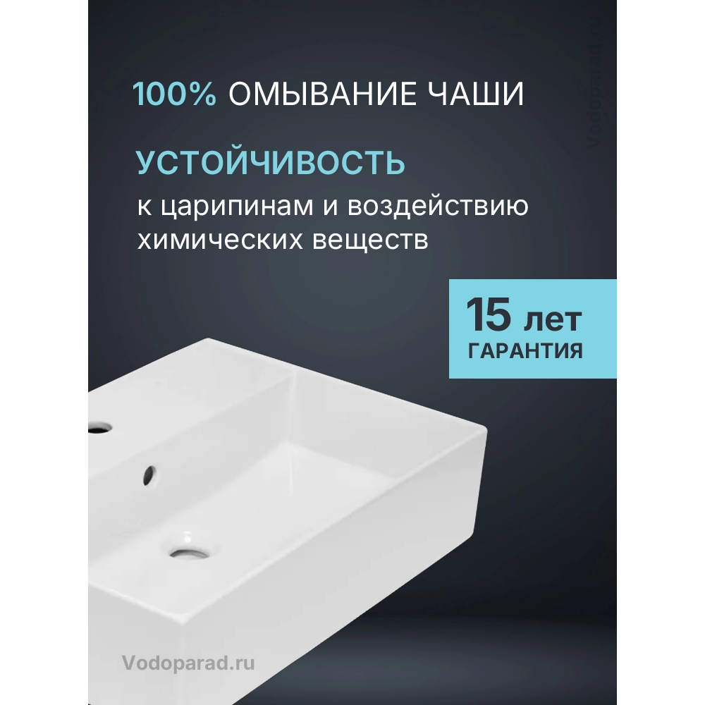 Глубокая чаша минимизирует брызги, вода в умывальнике не застаивается благодаря технологии идеального слива, несмотря на иллюзию плоского дна. Просторная полочка создана для расположения на ней ванных принадлежностей, а невысокие бортики вокруг нее не позволяют воде вытекать.