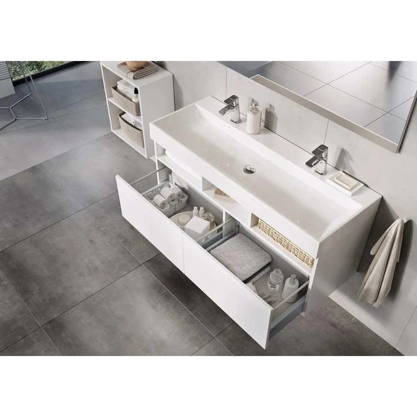 Двойной умывальник привносит в ванную комнату новое ощущение пространства. Единое пространство легче содержать в чистоте, а для стока воды вполне хватает одного слива.