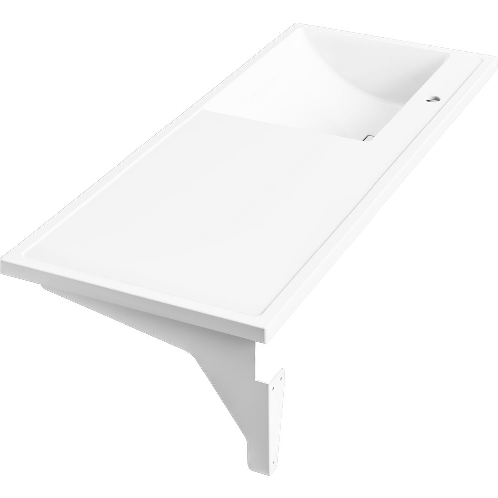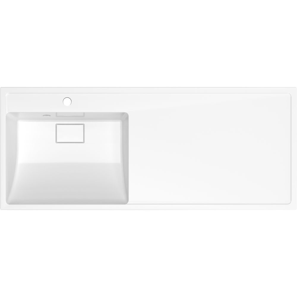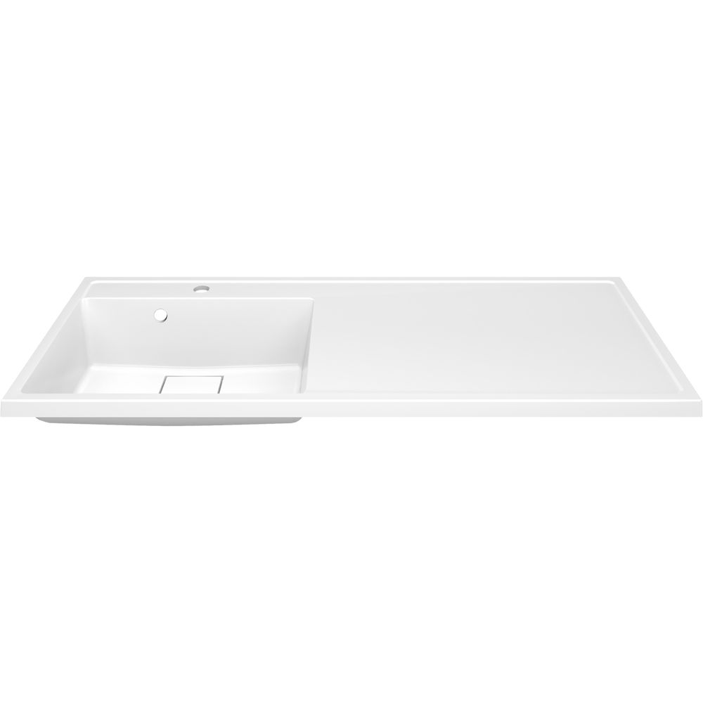 Раковина имеет размеры 110 на 50 см, что оптимально подходит для большинства стандартных ванных комнат. Изготовлена из износостойкого литьевого мрамора. Для подключения сифона предусмотрен диаметр 3.2 см. Отверстие для смесителя уже готово для установки. В комплект входит система слива-перелива и декоративная накладка на слив.