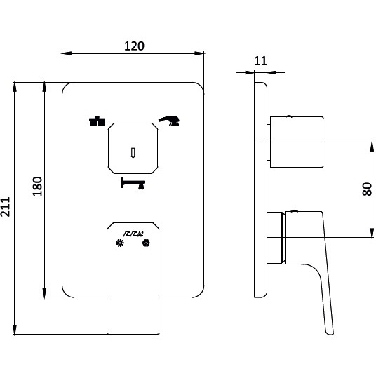 - Специальный трехходовой переключатель с маркировкой для лейки, ручного душа и излива