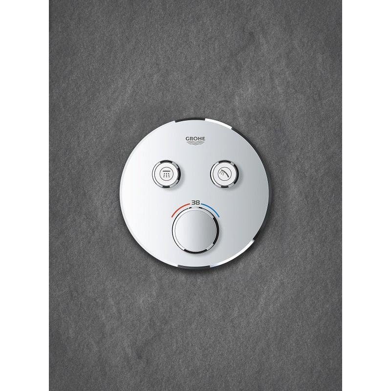 Добро пожаловать в мир инновационных решений для вашей ванной: термостатический смеситель Grohe Grohtherm SmartControl 29119000. Этот скрытый сантехнический шедевр гармонично дополнит любой современный интерьер. Вы оцените удобство и эстетическую привлекательность круглой металлической накладной панели, единственной видимой части устройства. Две кнопки SmartControl позволяют легко управлять двумя точками водоотвода: будь то ручной душ, верхний душ или излив для ванны. Подача воды контролируется с помощью нажатия, а напор — поворотом кнопки, обеспечивая водосберегающий режим EcoJoy при необходимости. С технологией GROHE TurboStat®, температура воды остается стабильной, а встроенный стопор безопасности предотвращает нагрев выше 38 °C, исключая риск ошпаривания. Хромированная отделка не только придает изделию блеск, но и обеспечивает простую очистку — всего лишь протрите мягкой салфеткой. Смеситель изготовлен из высококачественной антикоррозионной латуни, что гарантирует его долгий срок службы.