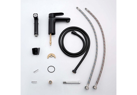 - Комплект поставки включает все необходимые элементы для быстрой установки — гибкую подводку, настенный держатель и монтажный комплект.