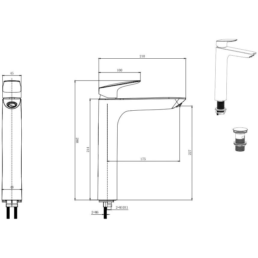 Смеситель имеет излив длиной 17.5 см и высотой 22.7 см, что обеспечивает удобство в использовании, позволяя легко совмещать его с различными моделями раковин. Изготовление из латуни гарантирует долгий срок службы и устойчивость к коррозии. Комплектация включает аэратор, гибкую подводку и крепления, а также донный клапан без перелива, который уже входит в стоимость.