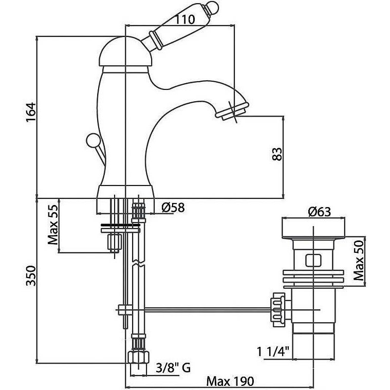 - Донный клапан: Оснащенный переливом, входит в стоимость, управление на корпусе.