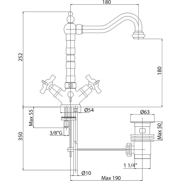 Смеситель имеет поворотный излив длиной и высотой 18 см, что делает его идеальным для повседневного использования. Изготовленный из прочной латуни, он обладает глянцевой поверхностью, придающей изделию элегантный блеск. В комплект поставки включены аэратор, гибкая подводка и крепления. Управление донным клапаном осуществляется при помощи рычага непосредственно на корпусе смесителя.