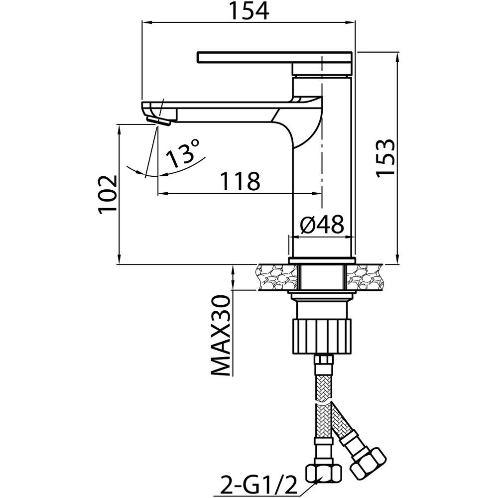 Смеситель для раковины выполнен из латуни с гладкой, глянцевой поверхностью, что придает ему изысканный вид. Высота излива составляет 10.2 см, а длина — 11.8 см, что обеспечивает удобный поток воды. Оснащён аэратором, который повышает эффективность использования воды. В комплекте также имеется система быстрого монтажа для легкой установки и гибкая подводка.