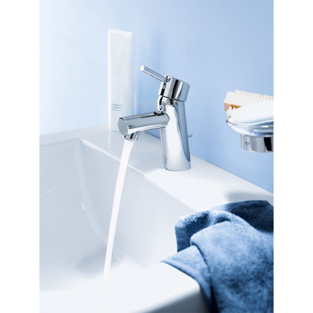 Смеситель для раковины Grohe Concetto 32204001 имеет излив длиной 10.1 см и высотой 6.6 см, что делает его идеальной находкой для большинства ванн. В комплект также входят аэратор и гибкая подводка для простоты подключения. Оснащен донным клапаном с переливом, который можно легко управлять с помощью рычага на корпусе.
