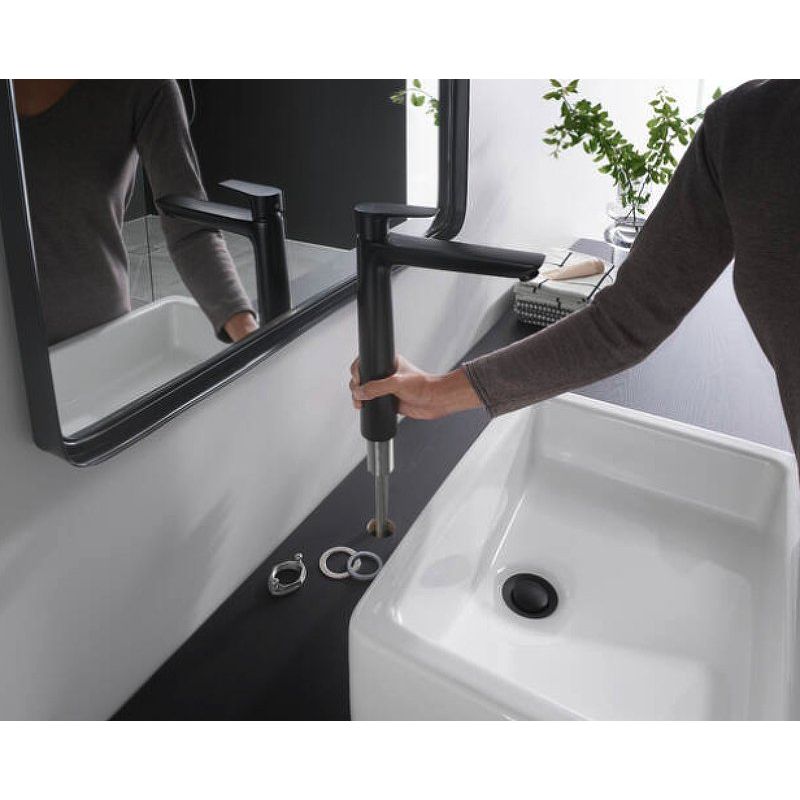 Смеситель для раковины Hansgrohe Talis E 240 71716670 в изысканном матовом черном цвете способен стать неотъемлемой частью современного интерьера вашей ванной комнаты. Инновационные технологии, такие как AirPower и EcoSmart, гарантируют значительную экономию воды без потери комфорта. Этот смеситель не только отлично выглядит, но и предлагает высокий уровень функциональности благодаря быстрому очищению благодаря системе QuickClean и регулируемому ограничению температуры.