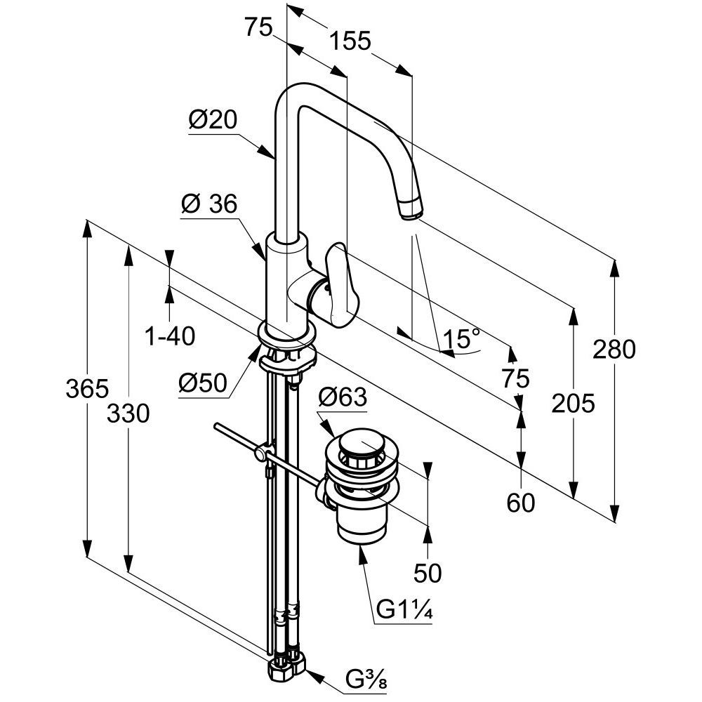 - Встроенный донный клапан с переливом, управление которым осуществляется рычагом на корпусе — полный контроль воды на кончиках ваших пальцев.