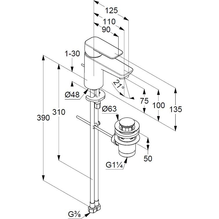 Смеситель Kludi Pure&Style имеет излив длиной 11 см и высотой 7.5 см, что делает его удобным для большинства стандартных раковин. В комплект входит донный клапан G 1 1/4 с переливом, а также гибкая подводка и крепления, которые упрощают процесс установки. Смеситель оснащен аэратором, который помогает экономить водные ресурсы.