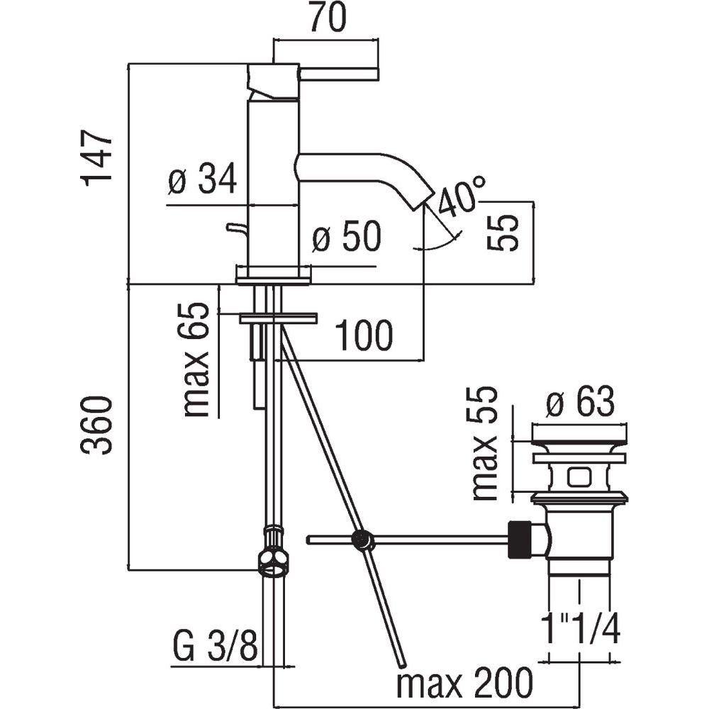 Смеситель имеет длину излива 10 см и высоту 5.5 см, что делает его удобным для различных типов раковин. В комплект входит донный клапан с функцией перелива, который управляется с помощью рычага на корпусе смесителя. Наличие ограничителя температуры предотвращает случайные ожоги, а гибкая подводка и крепления обеспечивают простоту установки.