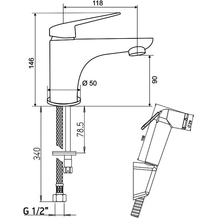 С изливом длиной 11.8 см и высотой 9 см, этот стильный смеситель идеально подходит для большинства раковин. Изготовленный из сочетания латуни и пластика, он сочетает в себе прочность и легкость. Смеситель оснащен аэратором, гибкой подводкой и всеми необходимыми креплениями. В комплект также входит душевой шланг, лейка гигиенического душа из пластика и настенный держатель.