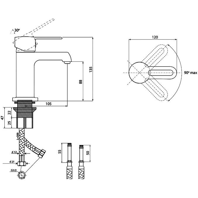 Смеситель выполнен из прочной латуни, что обеспечивает его надежность и долговечность. Длина излива составляет 10.5 см, а высота — 8.8 см, что делает его идеальным для использования в стандартных раковинах. Гладкая поверхность и глянцевый блеск придают элегантность и легкость в уходе. Оснащен аэратором с функцией легкого очищения и гибкой подводкой длиной 50 см.