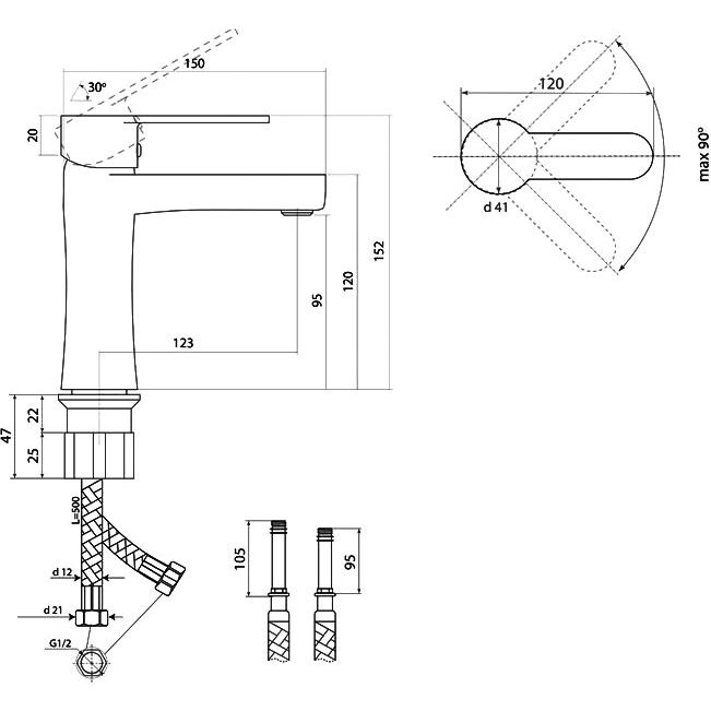 Смеситель изготовлен из высококачественной латуни, что обеспечивает долговечность и устойчивость к коррозии. Гибкая фибронейлоновая подводка длиной 50 см предотвращает образование конденсата и защищает от блуждающих токов. Высота излива составляет 9.5 см, а длина — 12.3 см, что оптимально для большинства раковин. Гладкая поверхность с глянцевым блеском придает изделию элегантный и современный вид.