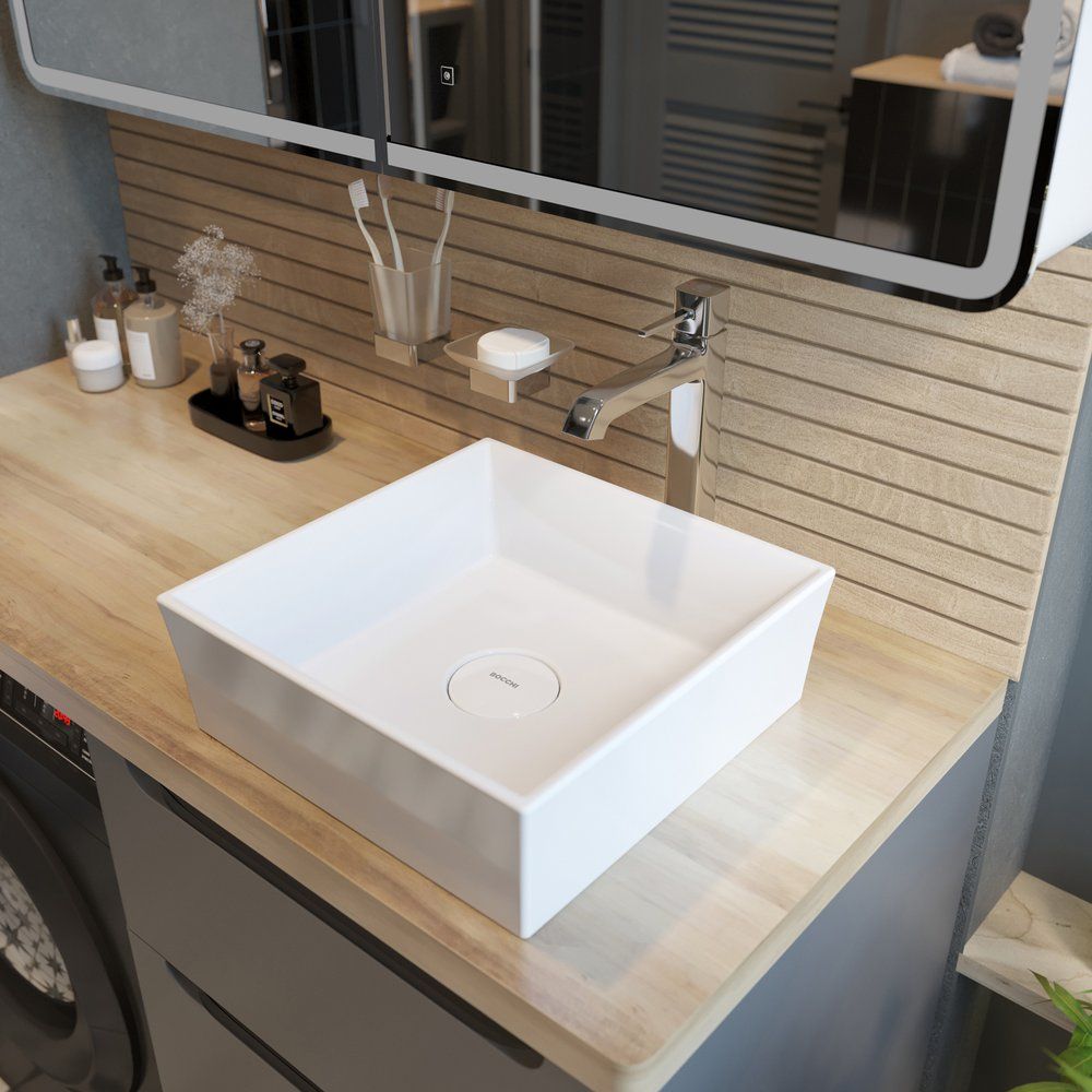 Учтите, что для установки может понадобиться дополнительное пространство за раковиной из-за высоты излива (21.5 см). Изделие поставляется с гибкой подводкой, поэтому вам не понадобится дополнительных переходников. Латунное основание и устойчивое покрытие гарантируют длительное использование даже в условиях высокой влажности.