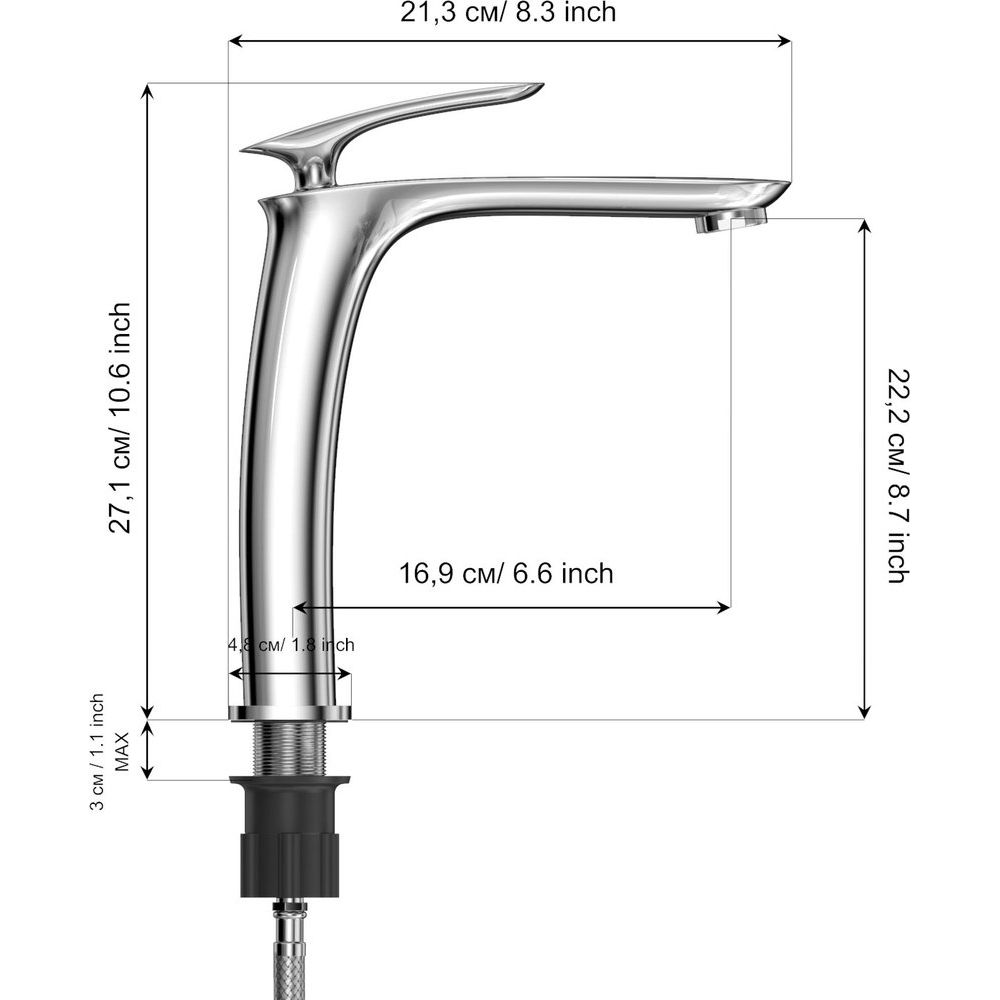 - Долговечность материалов и комплектующих: латунь и гибкая подводка.