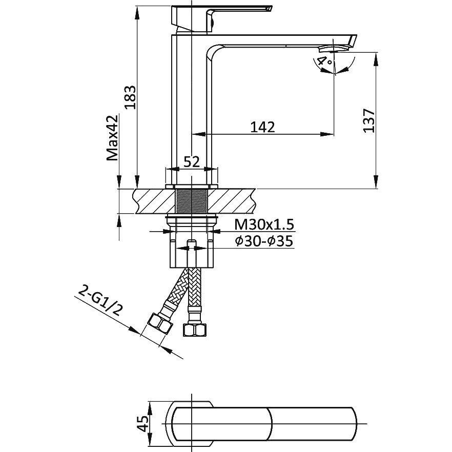 Смеситель изготовлен из надежной латуни и покрыт матовой черной краской, которая придает изделию стильный вид и устойчива к загрязнениям. Излив длиной 14.2 см и высотой 13.7 см обеспечивает удобное использование. Смеситель оснащен аэратором, который снижает расход воды без потери напора, а также гибкой подводкой и креплениями для легкой установки. Гарантия на смеситель составляет 5 лет, а на комплектующие — 1 год.