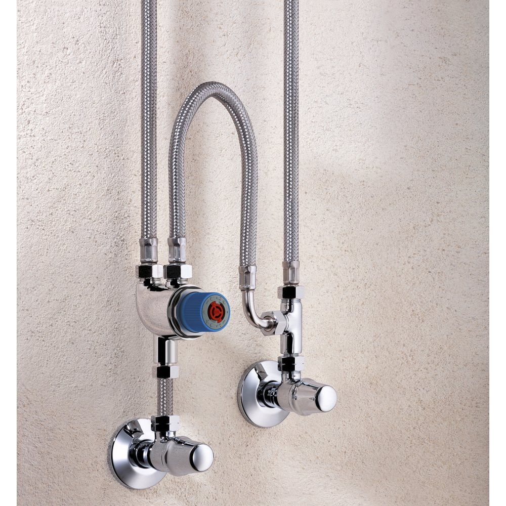 Смеситель изготовлен из прочной латуни с хромированным покрытием, отличающемся гладкостью и блеском. Он оборудован термостатом для поддержания постоянной температуры и встроенными клапанами, препятствующими обратному потоку воды. Внешняя резьба 3/8 сверху упрощает установку. Обратите внимание, что излив для смесителя требуется приобретать отдельно.