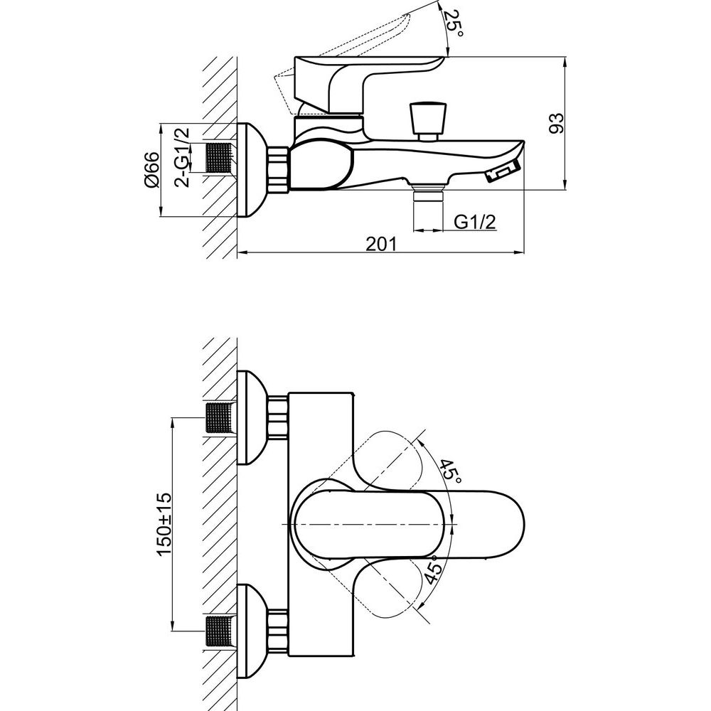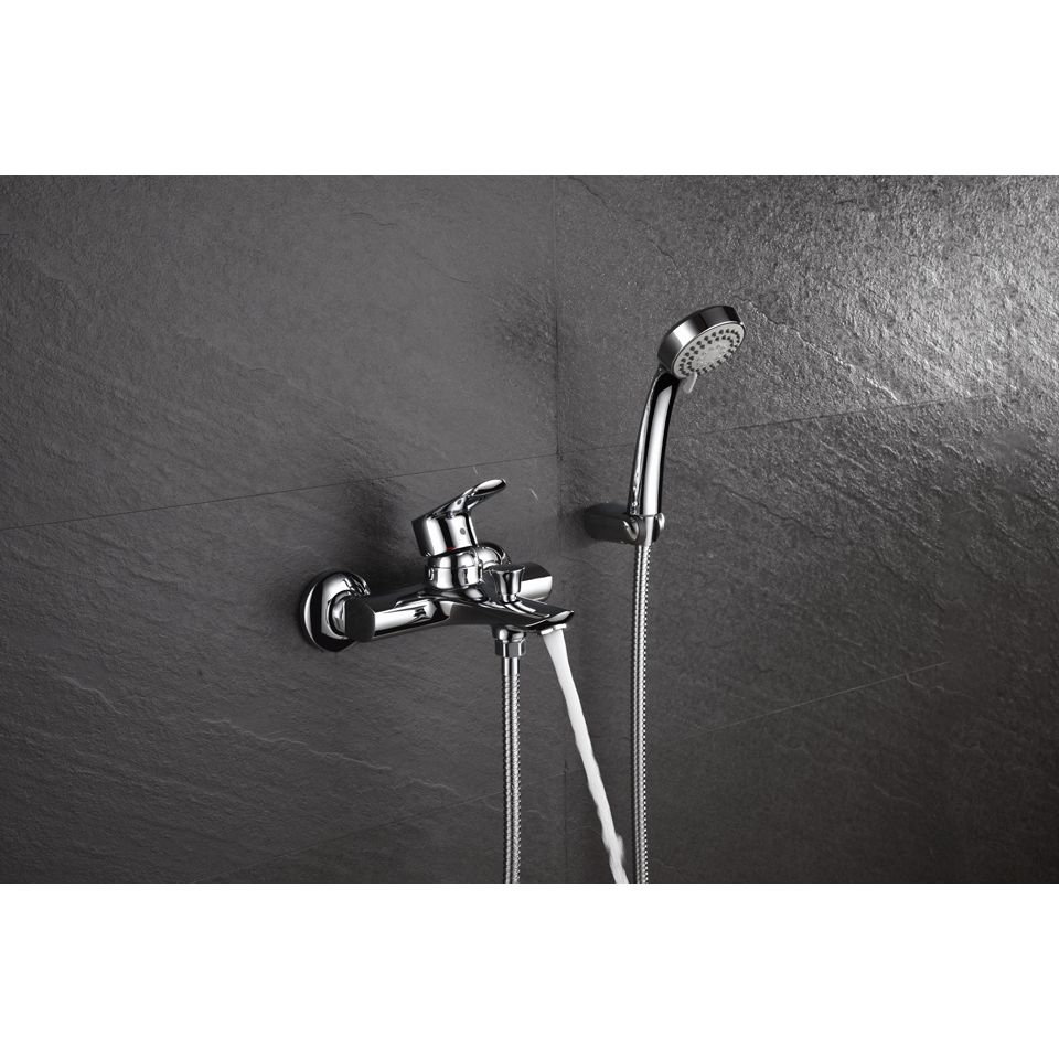 Дизайн смесителя дополнен глянцевой поверхностью и фиксированным изливом длиной 20.1 см. В комплект входит душевой гарнитур с лейкой на три режима и шлангом длиной 150 см. Дополнительно в комплект входят эксцентрики и настенный держатель. Гарантия составляет 5 лет.