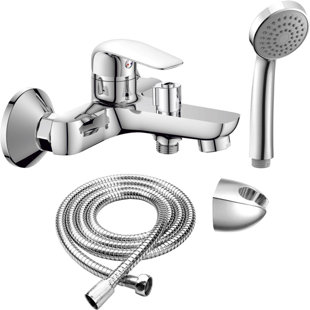 - В комплект входит душевой гарнитур, включающий лейку диаметром 8 см, шланг длиной 150 см и настенный держатель.