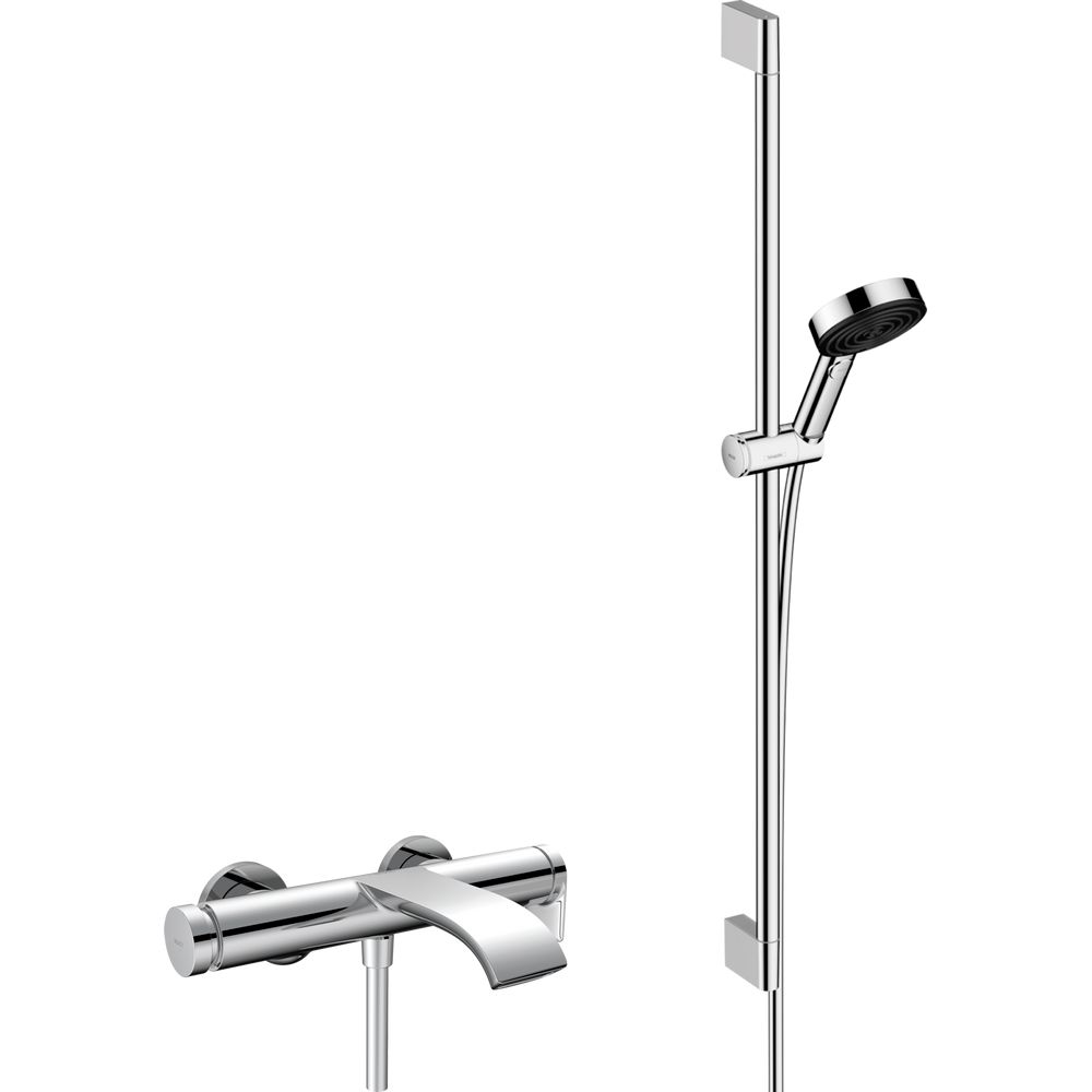 Смеситель для ванны Hansgrohe Vivenis с хромированной глянцевой поверхностью оснащен фиксированным изливом длиной 21.6 см, встроенным девиатором и керамическим картриджем. Он обеспечивает расход воды до 19.4 л/мин и имеет функции экономии расхода и защиты от обратного потока воды. Душевой гарнитур Hansgrohe Pulsify высотой 95.9 см включает пластиковый шланг длиной 160 см и душевую лейку с диаметром 10.5 см, выполненную из пластика и латуни. Гарантия на оба изделия составляет 5 лет.