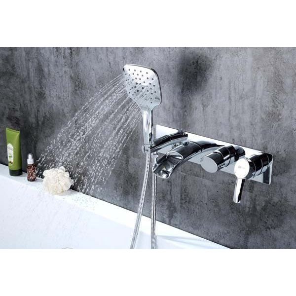 Смеситель изготовлен из латуни, что гарантирует его прочность и устойчивость к коррозии. Он оснащен фиксированным изливом длиной 14,9 см и рассчитан на стандартную подводку 1/2. В комплект также входят душевая лейка с тремя режимами, шланг длиной 200 см и держатель для душа. Глянцевая поверхность добавляет изысканности, придавая вашей ванной комнате современный вид.