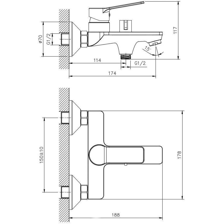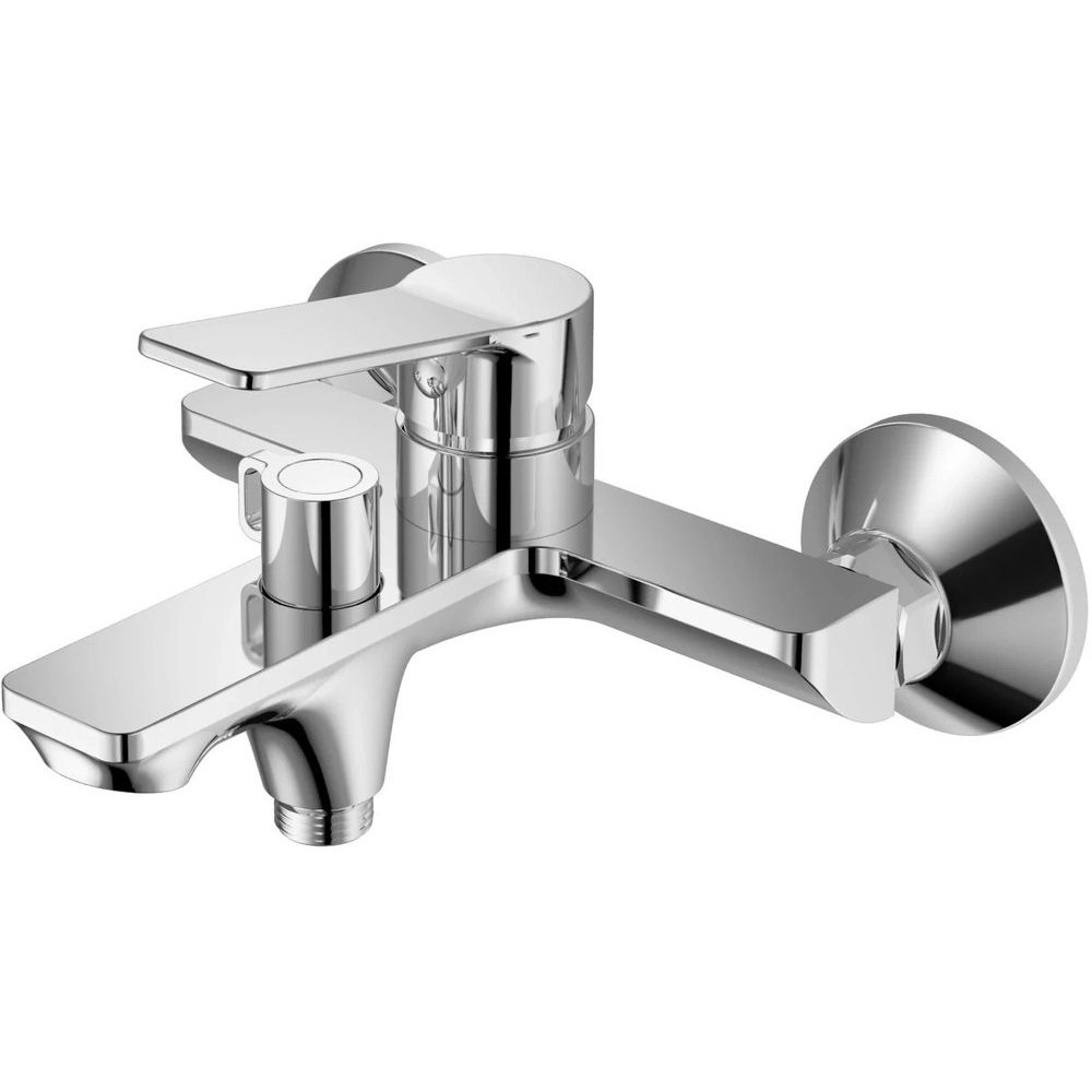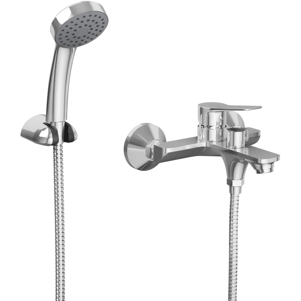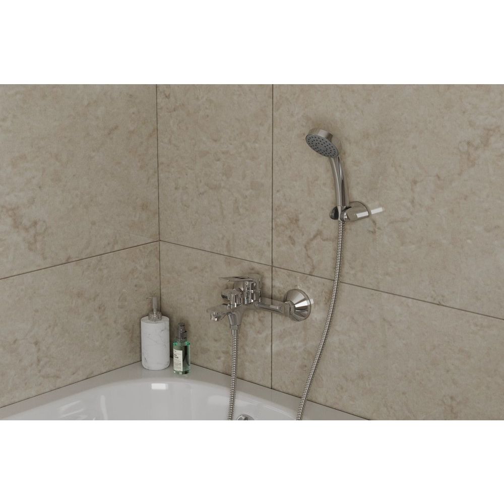 Смеситель оснащён пластиковым аэратором, расположенным под углом наклона 15 градусов, что обеспечивает равномерный поток воды. В комплекте идёт душевой гарнитур, включающий лейку с одним режимом струи размером 7,5 см и шланг длиной 150 см. Излив фиксированный, длиной 17,4 см, что оптимально подходит для большинства ванн. Настенный держатель упрощает установку и использование.