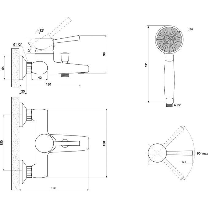 - Душевой шланг длиной 150 см обеспечивает комфортную подачу воды.