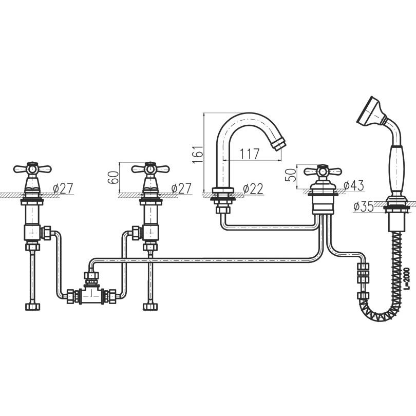 Смеситель имеет общую ширину излива 2.2 см и длину 11.7 см, что обеспечивает комфортное использование. Высота изделия составляет 16.1 см, подходящая для стандартной установки на борт ванны. Вентильное управление и переключатель потоков, размер которого 4.5 см, обеспечивают легкое переключение между режимами. Душевой гарнитур с лейкой 6.4 см в комплекте, а длина душевого шланга — целых 200 см.