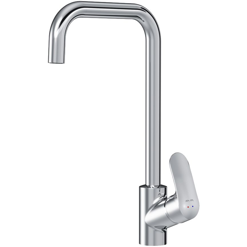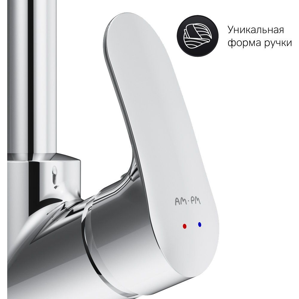 Смеситель выполнен из высококачественной латуни с хромированным покрытием, что гарантирует долговечность и блеск. Высота излива составляет 28.4 см, а длина – 19.4 см, что позволяет легко набирать воду в высокие ёмкости. Керамический картридж обеспечивает плавную и надежную работу. Гладкая глянцевая поверхность изделия добавляет элегантности кухне. Смеситель оснащён аэратором, гибкой подводкой и креплениями. Производитель AM.PM предлагает 10-летнюю гарантию на свою продукцию.