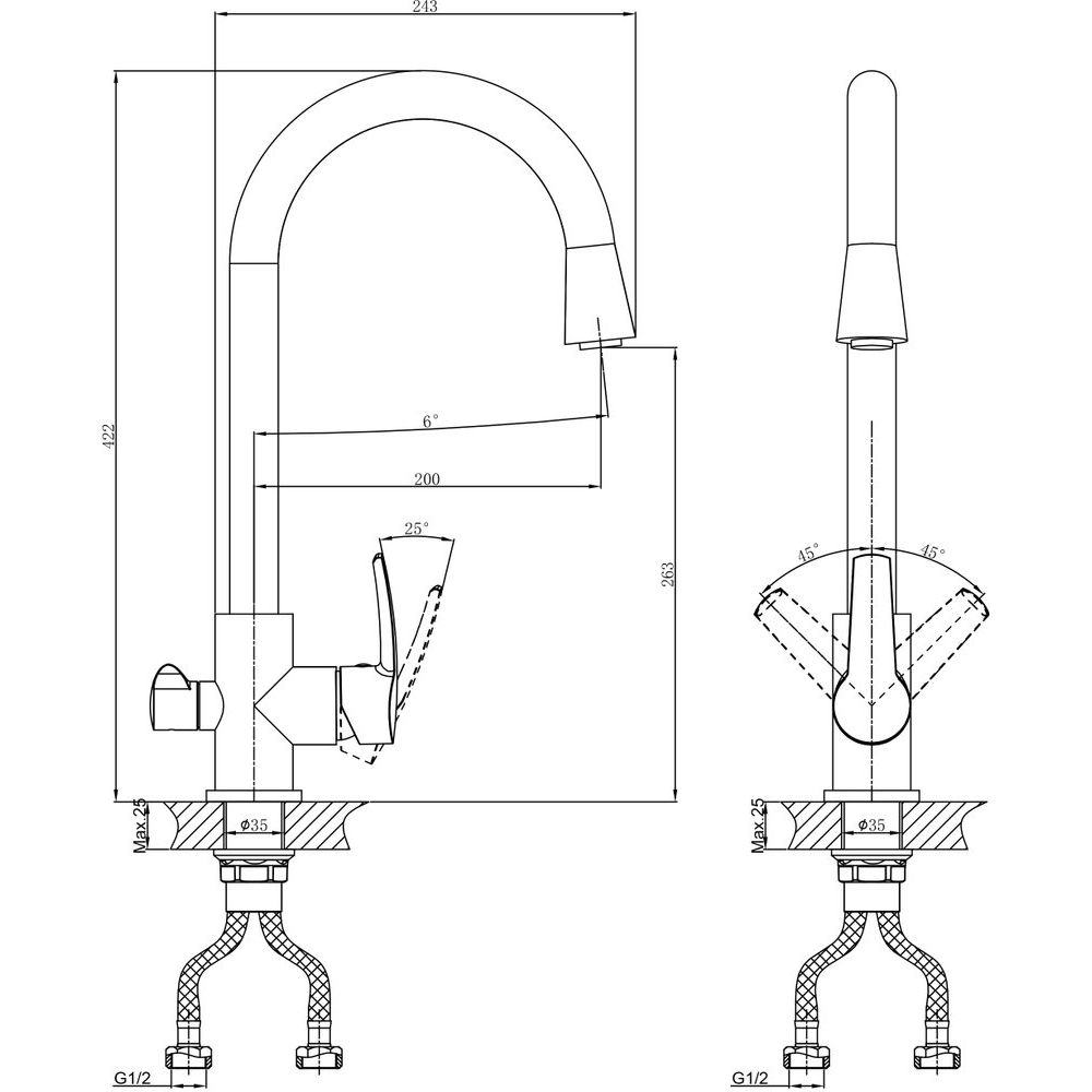 Смеситель D&K Rhein Valerius DA1361601 предлагается с глянцевой поверхностью, которая добавляет эстетики и современного стиля вашей кухне. Высота излива составляет 26,3 см, а длина — 20 см, обеспечивая комфорт и удобство в использовании. Совмещенный излив позволяет подавать как фильтрованную питьевую воду, так и обычную водопроводную, что делает смеситель еще более функциональным. Керамический картридж и гибкая подводка гарантируют легкость установки и долгий срок службы изделия.